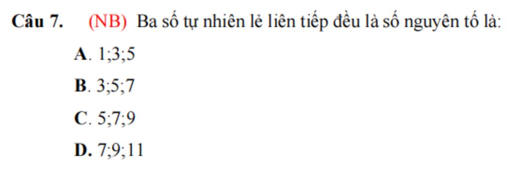 Vậy ba số tự nhiên lẻ liên tiếp đều là số nguyên tố là: `3;5;7`