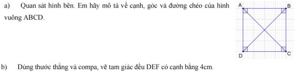 a) Quan sát hình bên. Em hãy mô tả về cạnh, góc và đường chéo của hình vuông ABCD.