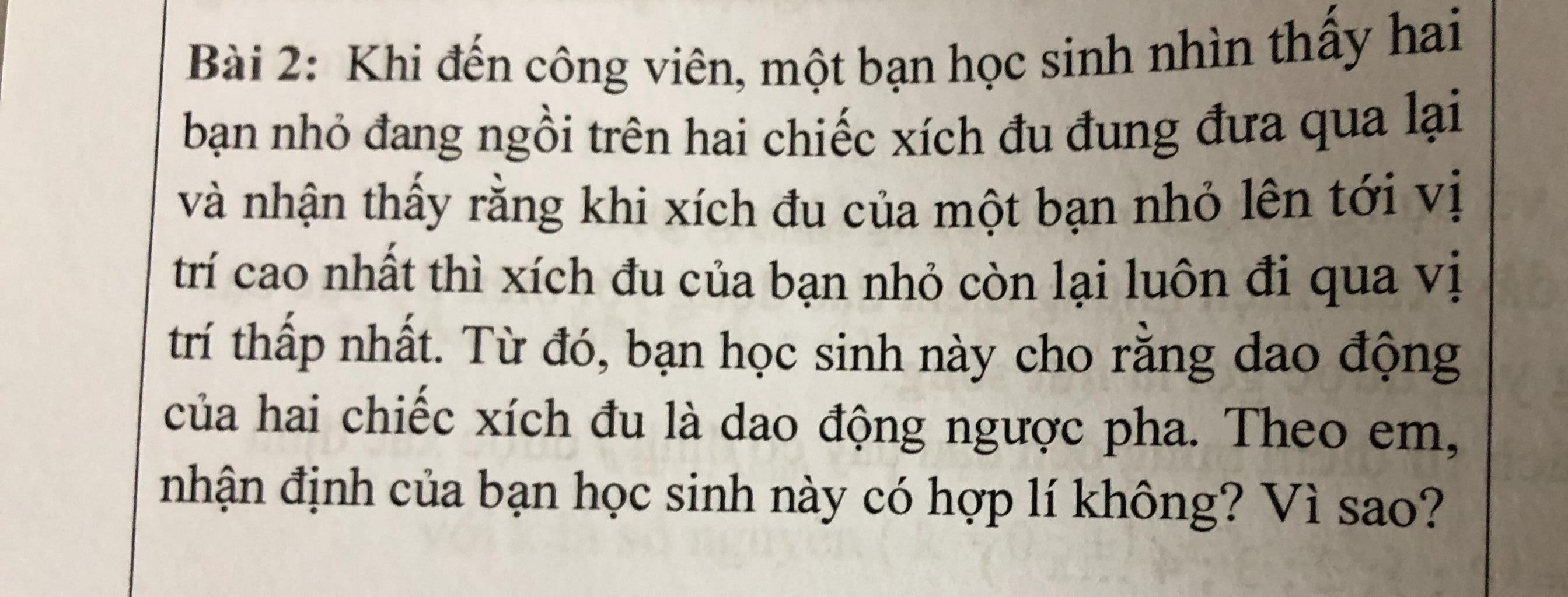 \(\Rightarrow\) dao động của hai chiếc xích đu là dao động vuông pha.