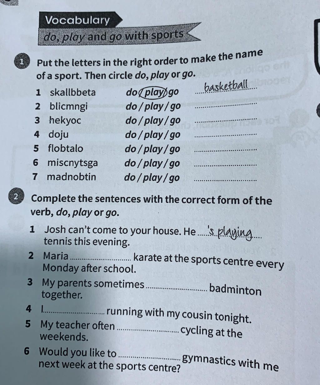 of a sport. Then circle do, play or go.