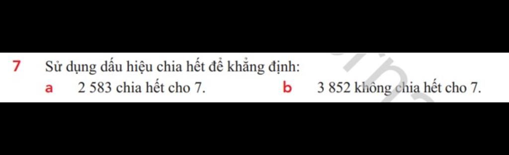 Lấy chữ số đầu tiên bên trái , nhân với 3 , được bao nhiêu cộng thêm với số thứ 2 , rồi được bao nhiêu lại nhân với số thứ 3 rồi lại cộng với số thứ tư . Làm như thế cho đến số cuối cùng bên phải . Nếu kết quả là một số chia hết cho 7 thì số đó chia hết cho 7 .