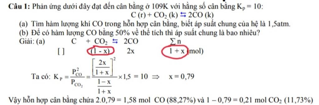 Do đó áp dụng công thức $K_p=\dfrac{P_1^2}{P_2}=\dfrac{X_1^2}{X_2}.P$ để tính $x$, từ đó tính $\%V$ khí ở TTCB.