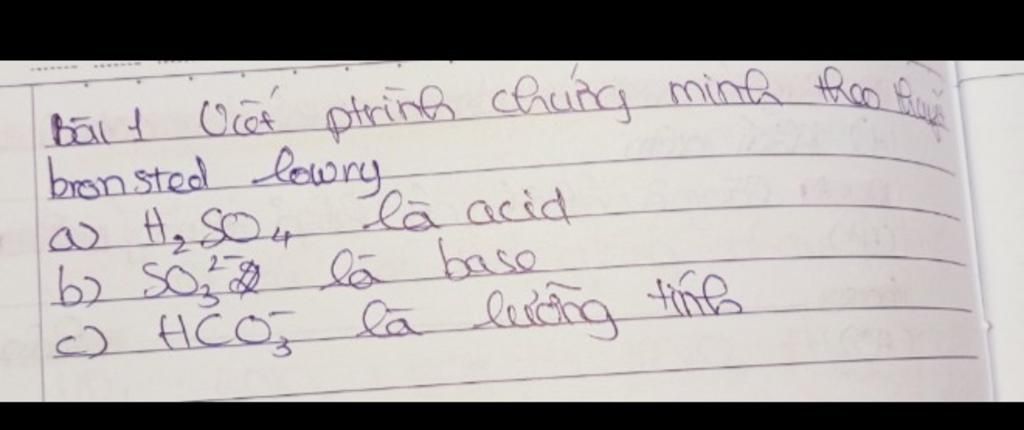 $HCO_3^-$ có thể cho hoặc nhận $H^+$ từ $H_2O$ nên là ion lưỡng tính.