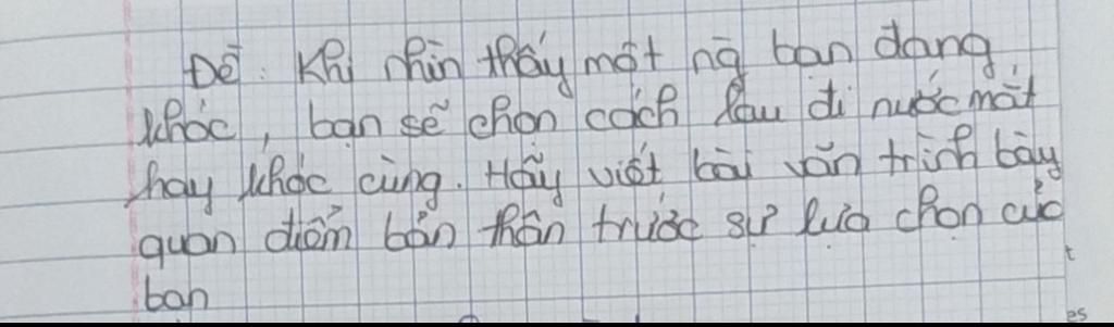 Có ai đó đã từng nói: ''Nước mắt là những ngôn từ trái tim không thể diễn tả''. Thật vậy, con người ai cũng có lúc buồn, có những lúc bất lực mà không thể nói ra. Và đó cũng chính là lúc ta khóc vì không thể kìm nén những cảm xúc buồn tủi, bất lực ấy nữa. Có lẽ, khi ta nhìn thấy một người nào đó đang khóc thì chắc hẳn chúng ta sẽ ........... (sự lựa chọn của bạn: ''lau nước mắt cho họ'' hoặc ''khóc cùng họ'')