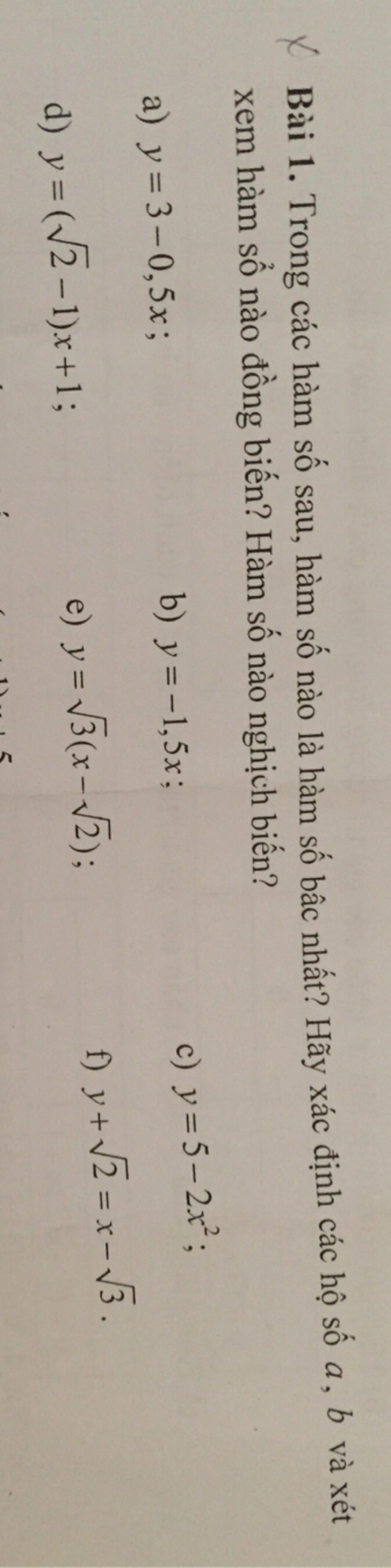 e.Hàm số $y=\sqrt3(x-\sqrt2)\to y=\sqrt3x-\sqrt5$ là hàm bậc nhất, đồng biến vì $a=\sqrt3>0$
