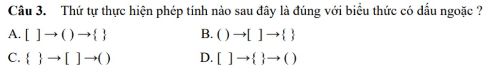 `***` Thứ tự thực hiện phép tính với biểu thức có dấu ngoặc là `()->[]->{}`