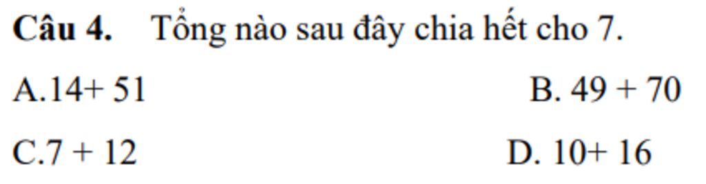 Chọn B do : 49 + 70 = 119 , 119 chia hết cho 7 .