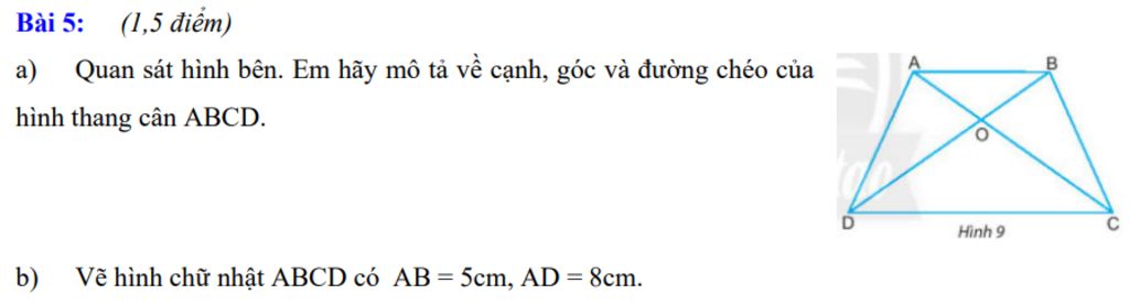 a) Quan sát hình bên. Em hãy mô tả về cạnh, góc và đường chéo của hình thang cân ABCD.