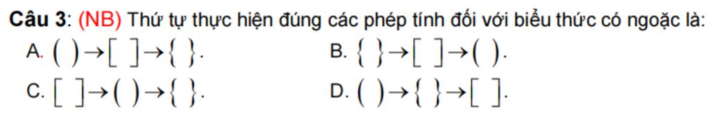 Thứ tự thực hiện đúng các phép tính đối với biểu thức có ngoặc bao gồm : thực hiện phép tính trong ngoặc tròn (...) trước. Tiếp đó là phá ngoặc rồi tính ngoặc vuông [...]. Cuối cùng là thực hiện phép tính trong ngoặc nhọn {...}