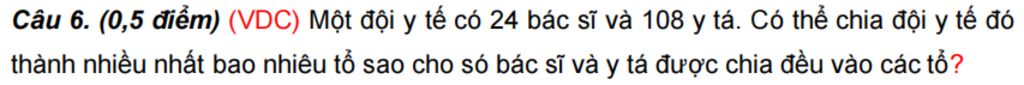 Vậy có thể chia đội y tế đó thành nhiều nhất `12` tổ để số bác sĩ và y tá được chia đều