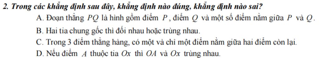 Đáp án:$A.$ Đoạn thẳng PQ là hình gồm điểm P , điểm Q và một số điểm nằm giữa P và Q .(Sai)