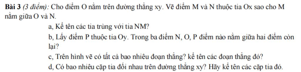 Bài 3 (3 điểm): Cho điểm O nằm trên đường thẳng xy. Vẽ điểm M và N thuộc tia Ox sao cho M nằm giữa O và N.