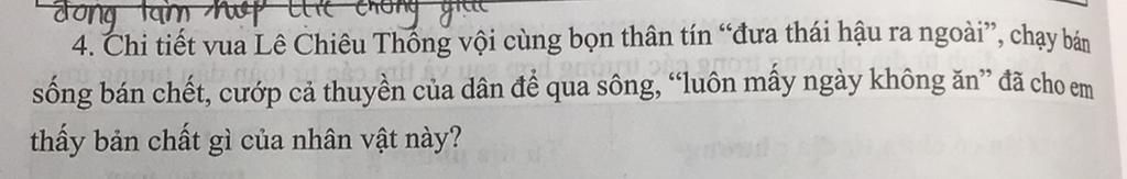 Chi tiết vua lê Chiêu thống cùng bọn thân tín "đưa thái hậu ra ngoài, chạy bán sống bán chết, cướp cả quyền của dân để qua sông, luôn mấy ngày không ăn" đã cho em thấy bản chất của nhân vật này: là người hèn nhát, ham sống sợ chết; không có tư cách làm bậc quân vương. Thân là vua của một đất nước, chỉ vì lợi ích về vật chất tầm thường mà đem vận mệnh của cả đất nước, tính mạng người dân cho giặc