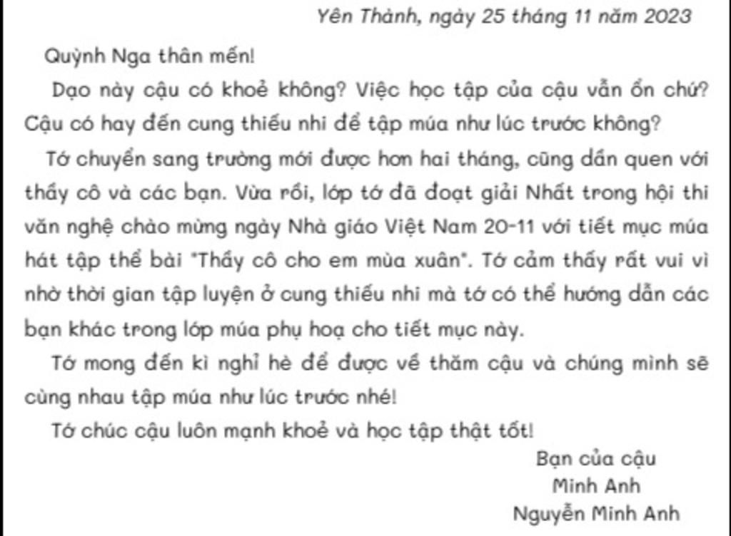 Bạn Minh Anh viết một bức thư gửi cho bạn Quỳnh Nga như hình ảnh dưới đây. Bạn Minh Anh cần bổ sung thêm nội dung nào để có được một bức thư hoàn chỉnh?