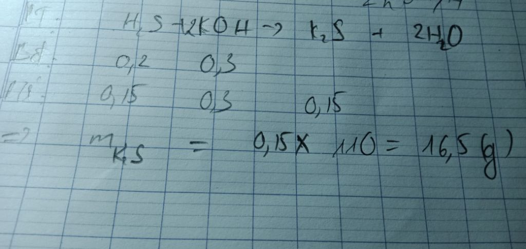 Vì 1 < nKOH/nH2S = 0,3/0,2 = 1,5 < 2 nên sản phẩm tạo 2 muối KHS và K2S