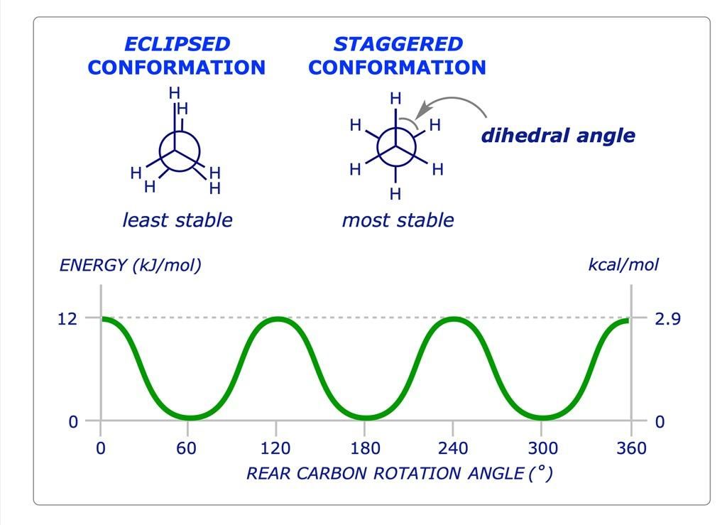 Liên kết đơn $C-C$ là liên kết được hình thành bởi sự xen phủ trục của hai orbital lai hoá $sp^3$ của hai nguyên tử carbon. Liên kết $C-C$ $\sigma$ có thể quay được quanh trục liên kết trong khi liên kết $\pi$ không quay được vì nếu quay, hai orbital chưa lai hoá sẽ không song song với nhau nên sự xen phủ bên giảm, làm vỡ liên kết $\pi$. Nếu cố định một carbon và quay carbon còn lại quanh trục liên kết, chỉ cần quay một góc nhỏ, phân tử đã tồn tại ở cấu dạng mới, do đó ethane có vô số đồng phân cấu dạng. Ta quan tâm đến hai cấu dạng đặc biệt: cấu dạng che khuất (các liên kết $C-H$ trước và sau trùng nhau) và cấu dạng xen kẽ (các liên kết $C-H$ trước và sau xen kẽ nhau). Cấu dạng che khuất kém bền vững nhất, năng lượng cao nhất do sức đẩy giữa các hydrogen là lớn nhất (vị trí gần nhau nhất) còn cấu dạng xen kẽ có mức năng lượng thấp nhất.