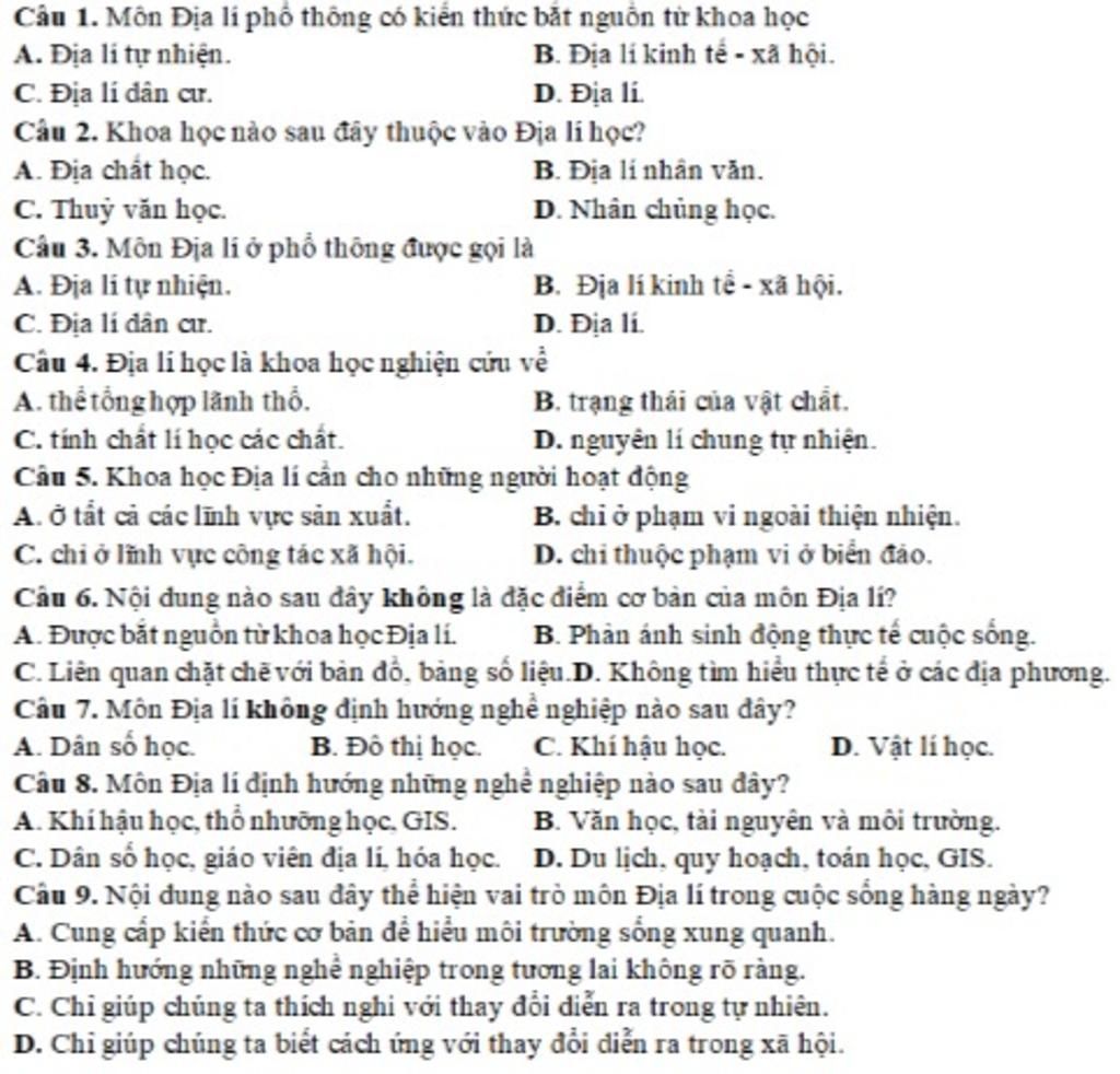 `***` Môn Địa lí phổ thông tổng hợp kiến thức từ cả địa lí tự nhiên, dân cư, kinh tế - xã hội