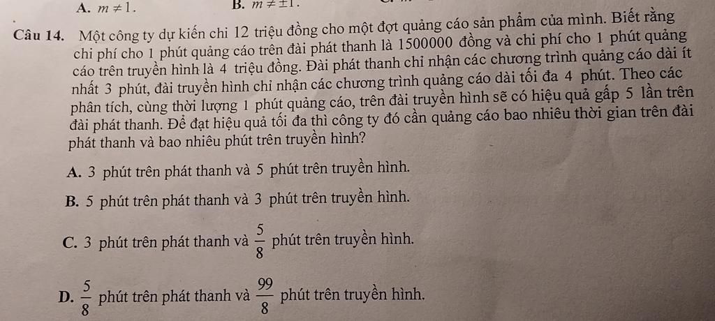 Câu 14. Một công ty dự kiến chỉ 12 triệu đồng cho một đợt quảng cáo sản phẩm của mình. Biết rằng