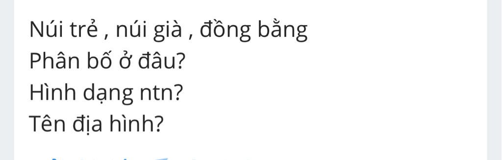 Bạn phải ghi rõ phân bố , hình dạng , tên địa hình mình mới biết chứ