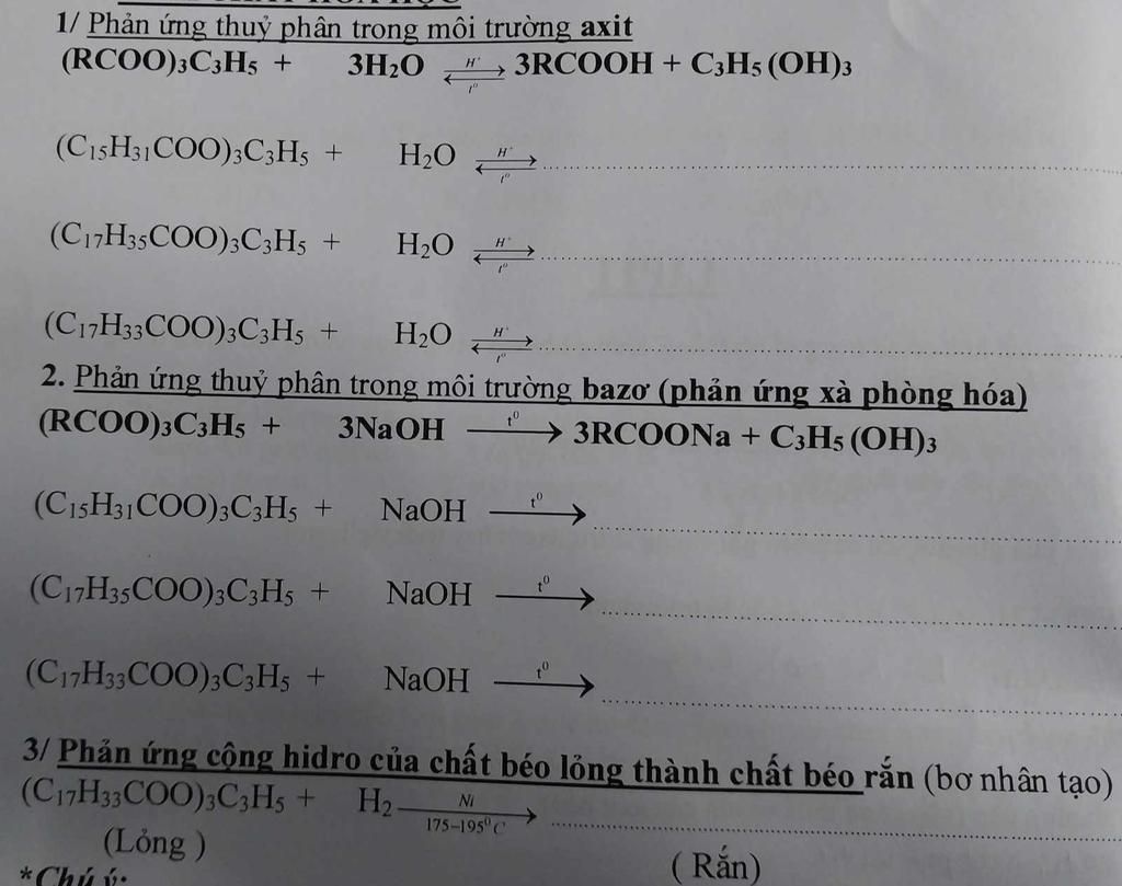 $(C_{17} H_{35}COO)_3C_3H_5+3H_2O \buildrel{{t^o,H^+}}\over\rightleftharpoons 3C_{17}H_{35}COOH+C_3H_5(OH)_3$