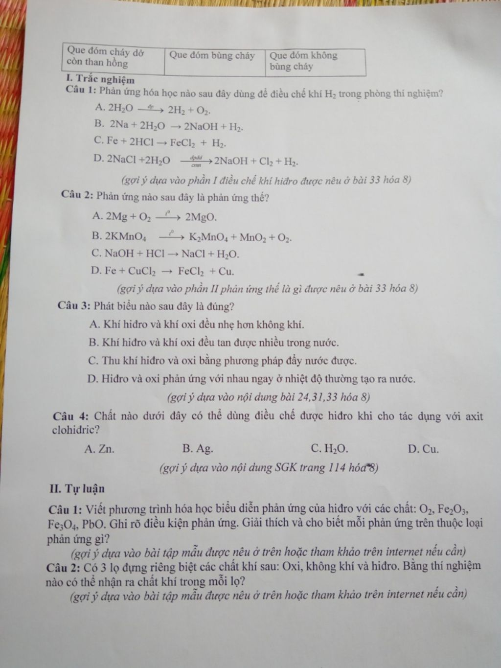 – Lọ làm que đóm cháy với ngọn lửa màu xanh mờ và có tiếng nổ lách tách nhẹ là lọ chứa hi đro (hoặc lọ còn lại chứa hiđro)