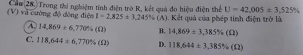 Vậy đáp án đúng là B. \( 14,869 \pm 3,385 \%(\Omega) \)