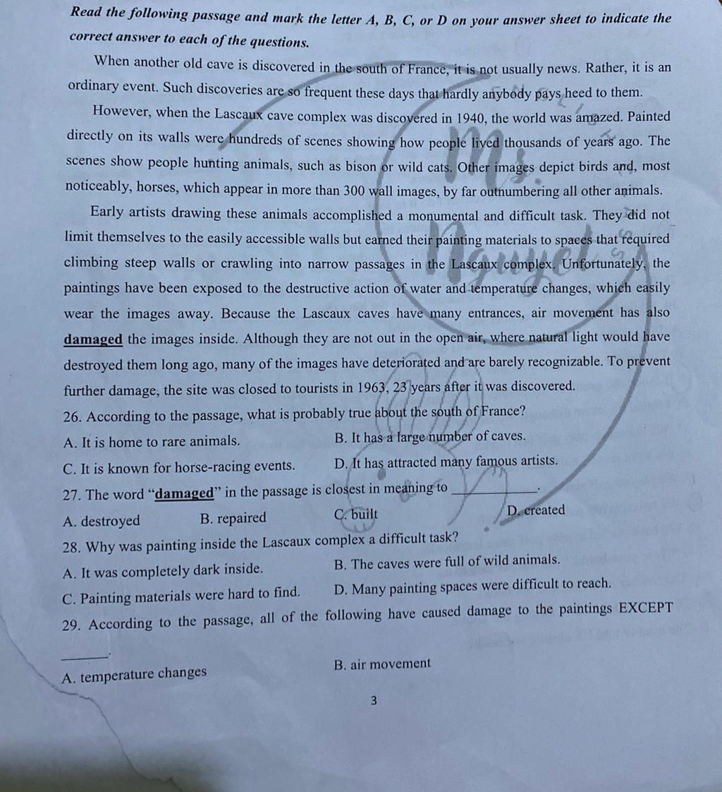 29.According to the passage, all of the following have caused damage to the paintings EXCEPT _____ A. temperature changes B.air movement C. w ater D.light 30.What does the passage say happend at the Lascus caves in 1963 A.another part was discovered B.A new lighting system was installed C.Visitors were prohibited from enterning D.A new entrance was created Rút gọn29.According to the passage, all of the following have caused damage to the paintings EXCEPT _____ A. temperature changes B.air movement ... xem thêm