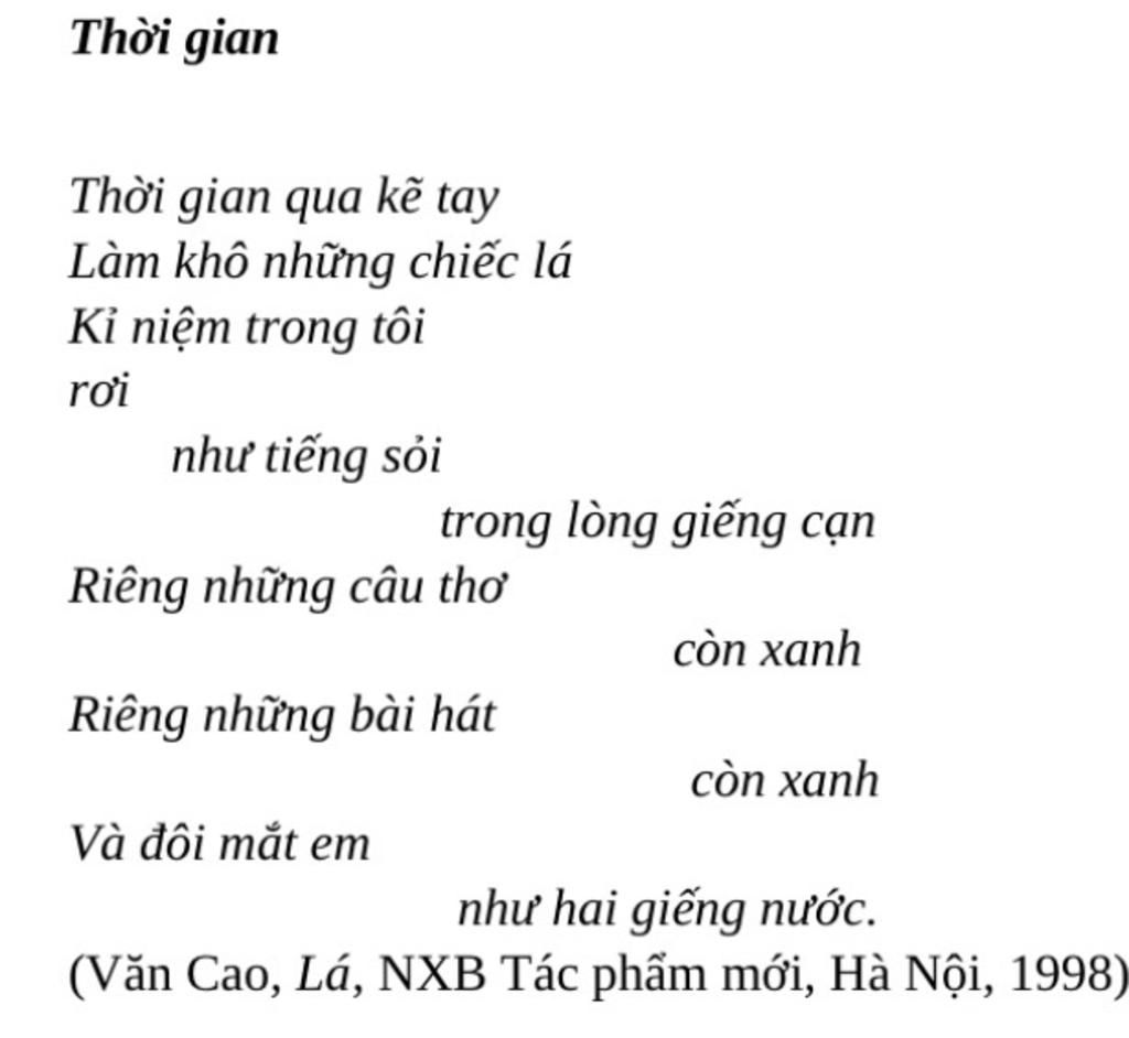 ⇒ Văn Cao, như nhiều nhà thơ và nhà văn khác, có thể đã sử dụng “Thời gian” như một biểu tượng để truyền đạt các ý tưởng và cảm xúc phức tạp. Thời gian có thể được hiểu như một lực lượng không thể kiểm soát được, một thực tế không thể tránh khỏi của cuộc sống.