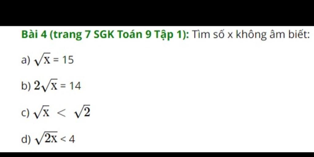 `c)` `\sqrt{x} < \sqrt{2}` `( ĐK : x >= 0 )`