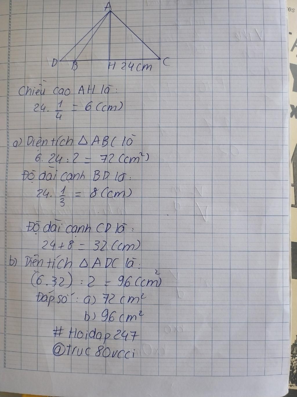 Cho tam giác ABC có đáy BC = 24cm chiều cao AH =$\frac{1}{4}$ BC