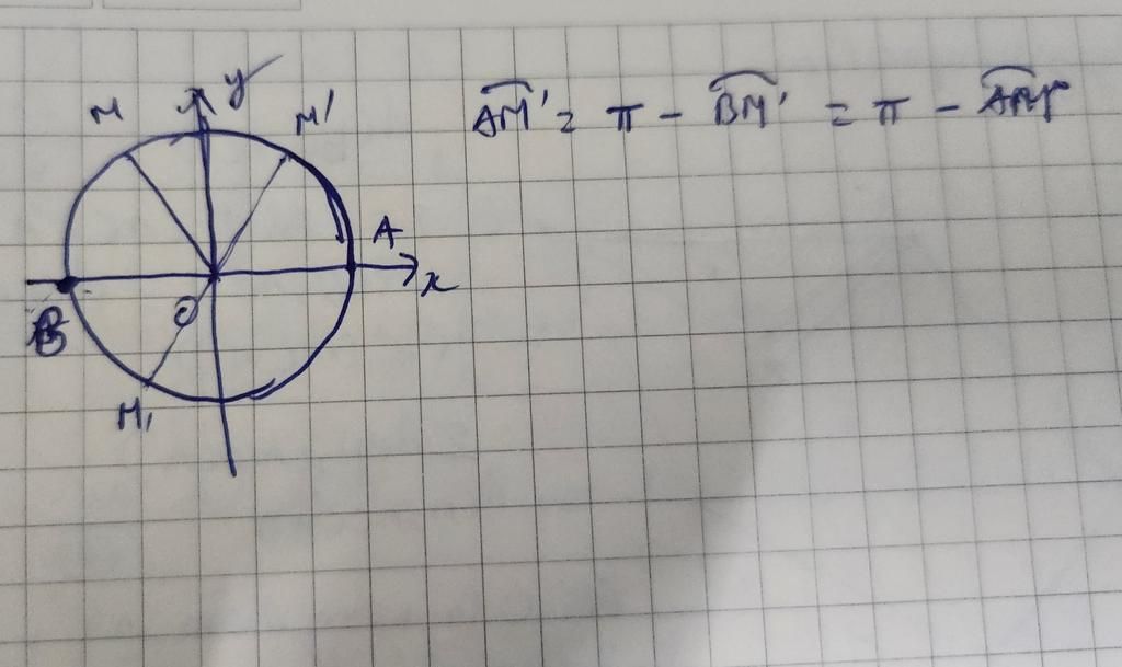 $\begin{array}{l} \mathop{AM'}\limits^{\displaystyle\frown}= \mathop{AM}\limits^{\displaystyle\frown} - + k2\pi = - \dfrac{{3\pi }}{5} + k2\pi \\ = 2\pi - \left( { - \dfrac{{3\pi }}{5}} \right) + k2\pi = \dfrac{{7\pi }}{5} + k2\pi \\ \Rightarrow \alpha = \dfrac{{7\pi }}{5}\\ \mathop{AM''}\limits^{\displaystyle\frown}= \pi - \dfrac{{3\pi }}{5} + k2\pi = \dfrac{{2\pi }}{5} + k2\pi \\ \Rightarrow \beta = \dfrac{{2\pi }}{5} \Rightarrow \alpha + \beta = \dfrac{{9\pi }}{5} \end{array}$