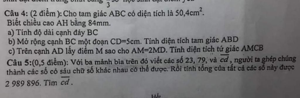 Câu 4: (2 điểm ): Cho tam giác ABC có diện tích là 50,4cm.