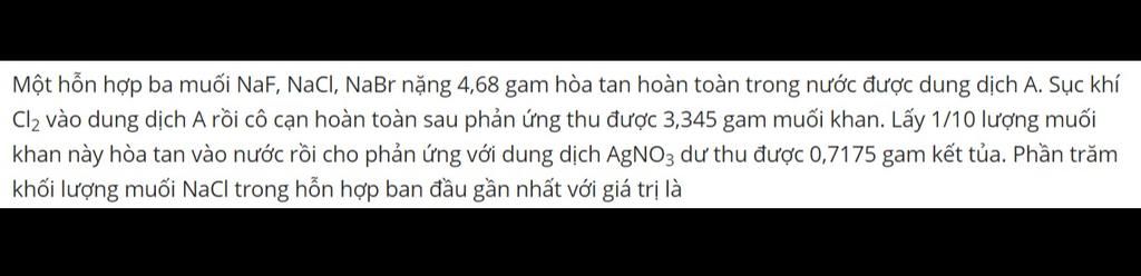 `1/{10}\ A` có `NaCl:0,1y+0,1z(mol);NaF:0,1x(mol)`