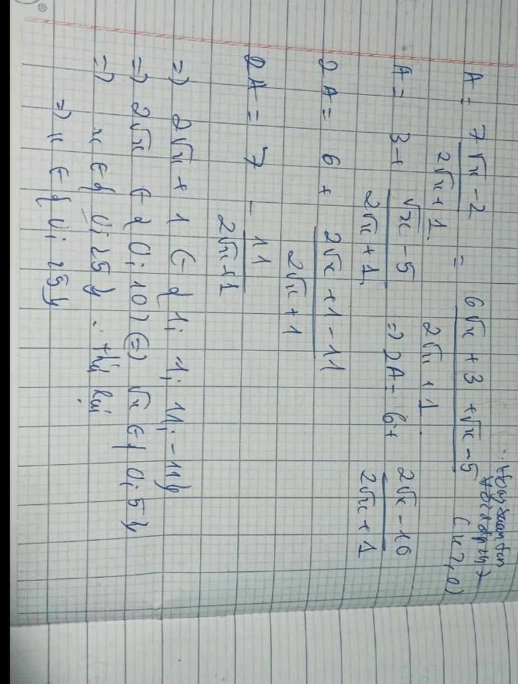 Để `2A in NN**` thì `0 < 11/(2sqrtx+1) < 7` và `11/(2sqrtx +1) in NN**`