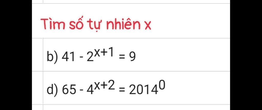 `d) 65 - 4^(x + 2) = 2014^0`