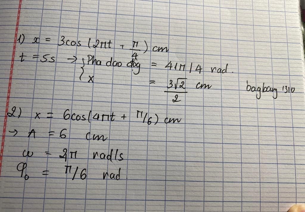 x=3cos(2πt+π/4) (cm) xác định pha dao động, li độ của vật vào thời điểm t=5s kể từ thời điểm ban đầu