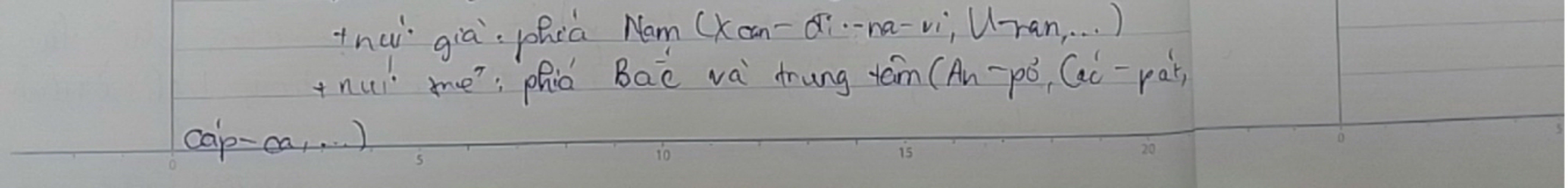 + Núi già : phía nam (Xan đi na vi U-ran,..)
