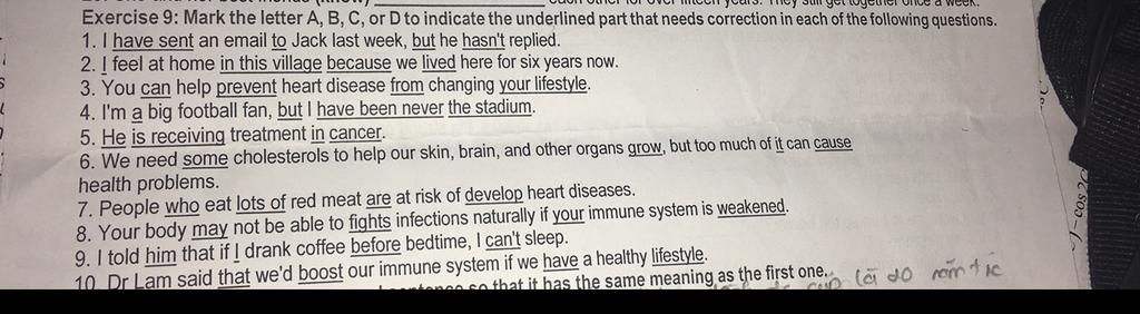 Exercise 9: Mark the letter A, B, C, or D to indicate the underlined part that needs correction in each of the following questions.