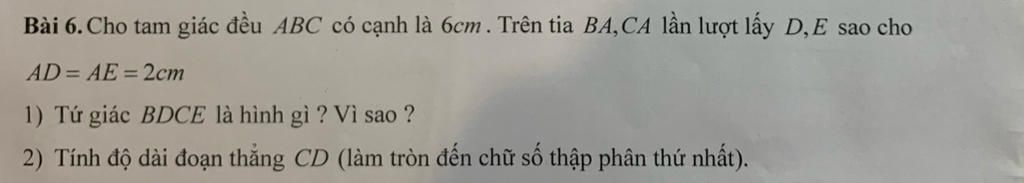 Bài 6. Cho tam giác đều ABC có cạnh là 6cm . Trên tia BA,CA lần lượt lấy D,E sao cho