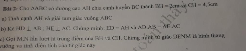 Bài 2: Cho AABC có đường cao AH chia cạnh huyền BC thành BH = 2cm và CH = 4,5cm