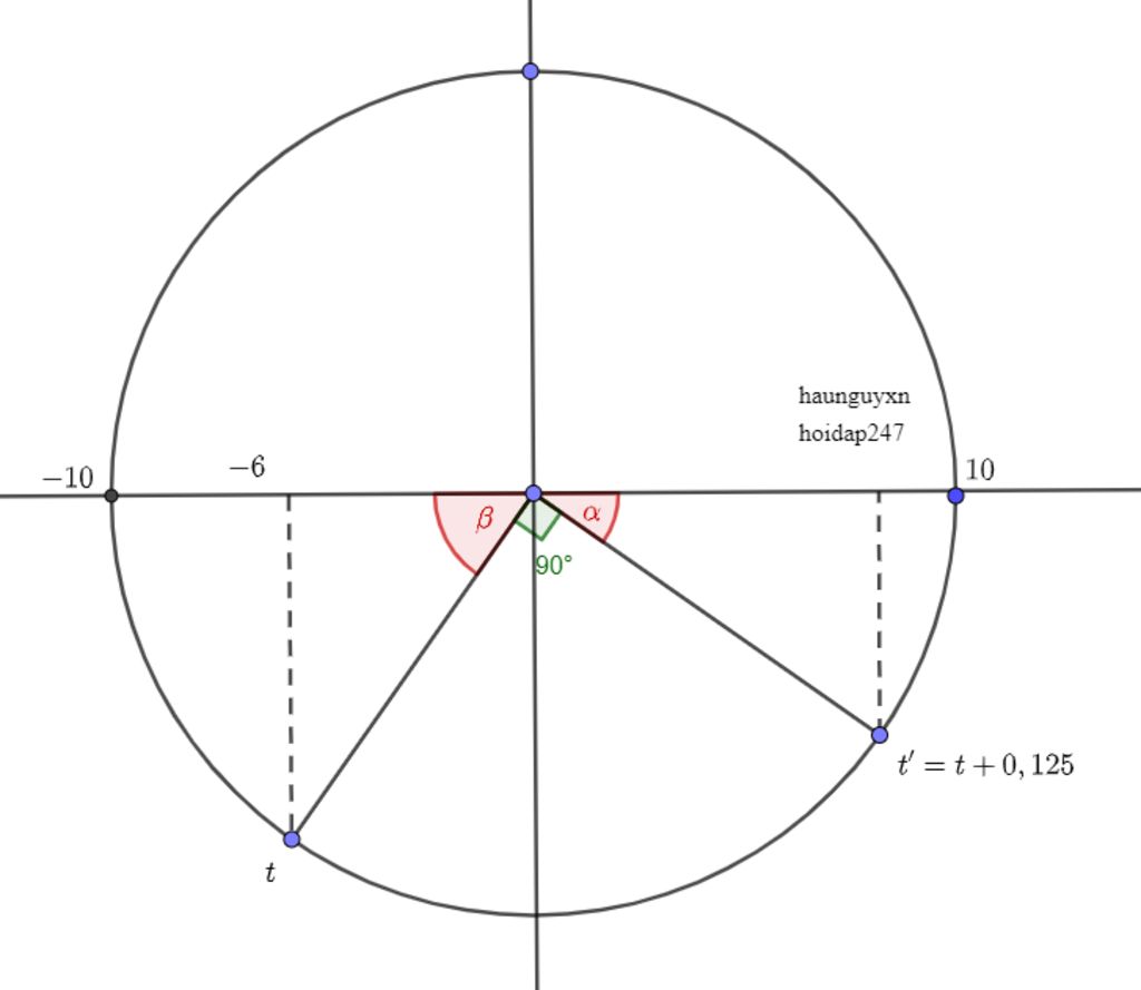 Góc quét sau `0,125(s)` là \(\alpha=\dfrac{t}{T}.360=\dfrac{0,125}{\dfrac{1}{2}}.360=90^o\\\Rightarrow x=A.\cos\alpha=A.\sin\beta=A.\sqrt{1-\cos^2\beta}=10.\sqrt{1-\left(\dfrac{6}{10}\right)^2}=8(cm)\\2)\\x=3\cos\left(10\pi t-\dfrac{\pi}{6}\right)\\v=A\omega\cos\left(\omega t+\varphi +\dfrac{\pi}{2}\right)=30\pi\cos\left(10\pi t-\dfrac{\pi}{6}+\dfrac{\pi}{2}\right)=30\pi \cos\left(10\pi t+\dfrac{\pi}{3}\right)\\t=\dfrac{1}{60}(s)\Rightarrow \begin{cases} x=3\cos\left(10\pi \dfrac{1}{60}-\dfrac{\pi}{6}\right)=3(cm)\\v=30\pi \cos\left(10\pi .\dfrac{1}{60}+\dfrac{\pi}{3}\right)=0\\a=-\omega^2x=-30\pi^2(cm/s^2)\end{cases}\)