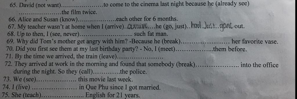 67. My teacher wasn't at home when I (arrive)..Cuvie....he (go, just)..hal.Just.. gone out.