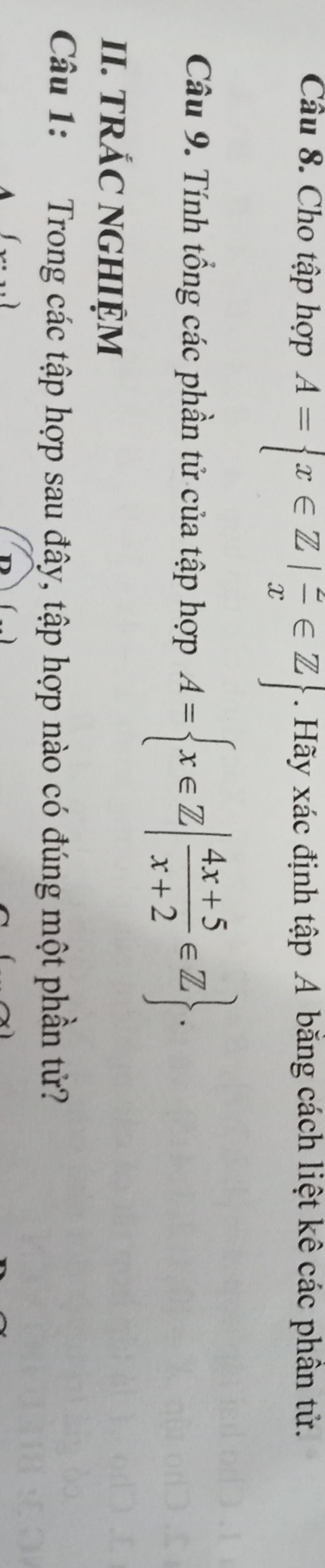 Câu 8. Cho tập hợp A = {x ∈ Z|~ eZ}. Hãy xác định tập A bằng cách liệt kê các phần tử.
