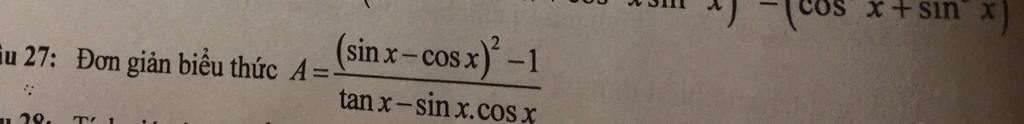 `= ((sin^2 x + cos^2 x) - 2sin x * cos x - 1)/((sin x)/(cos x) - sin x - cos x)`