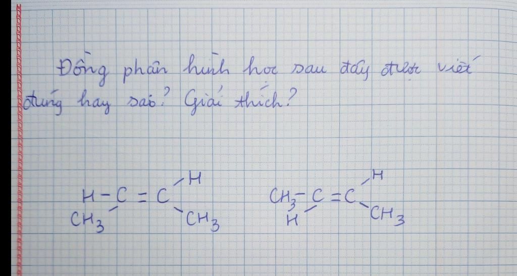 Hai đồng phân hình học được viết sai vì các nguyên tử carbon không no đều ở trạng thái lai hoá $sp^2$ nên góc liên kết $120^oC$, ngoài ra hai carbon không no, hai carbon của nhóm methyl và hai hydrogen liên kết với carbon không no thì đồng phẳng với nhau.