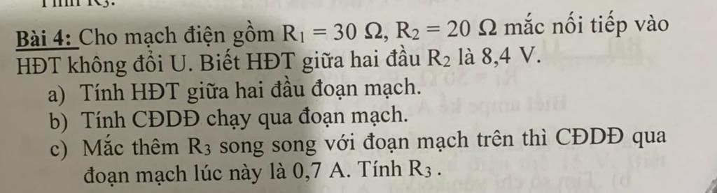 Bài 4: Cho mạch điện gồm Rı = 30 Q, Rz = 20 Q mắc nối tiếp vào