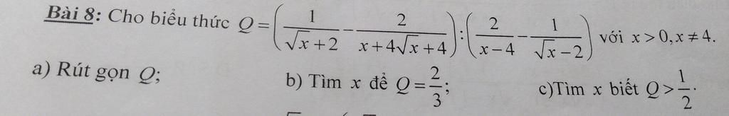 a) `Q = ((1/(sqrtx + 2) - 2/(x + 4sqrtx + 4)) : (2/(x - 4) - 1/(sqrtx - 2))`