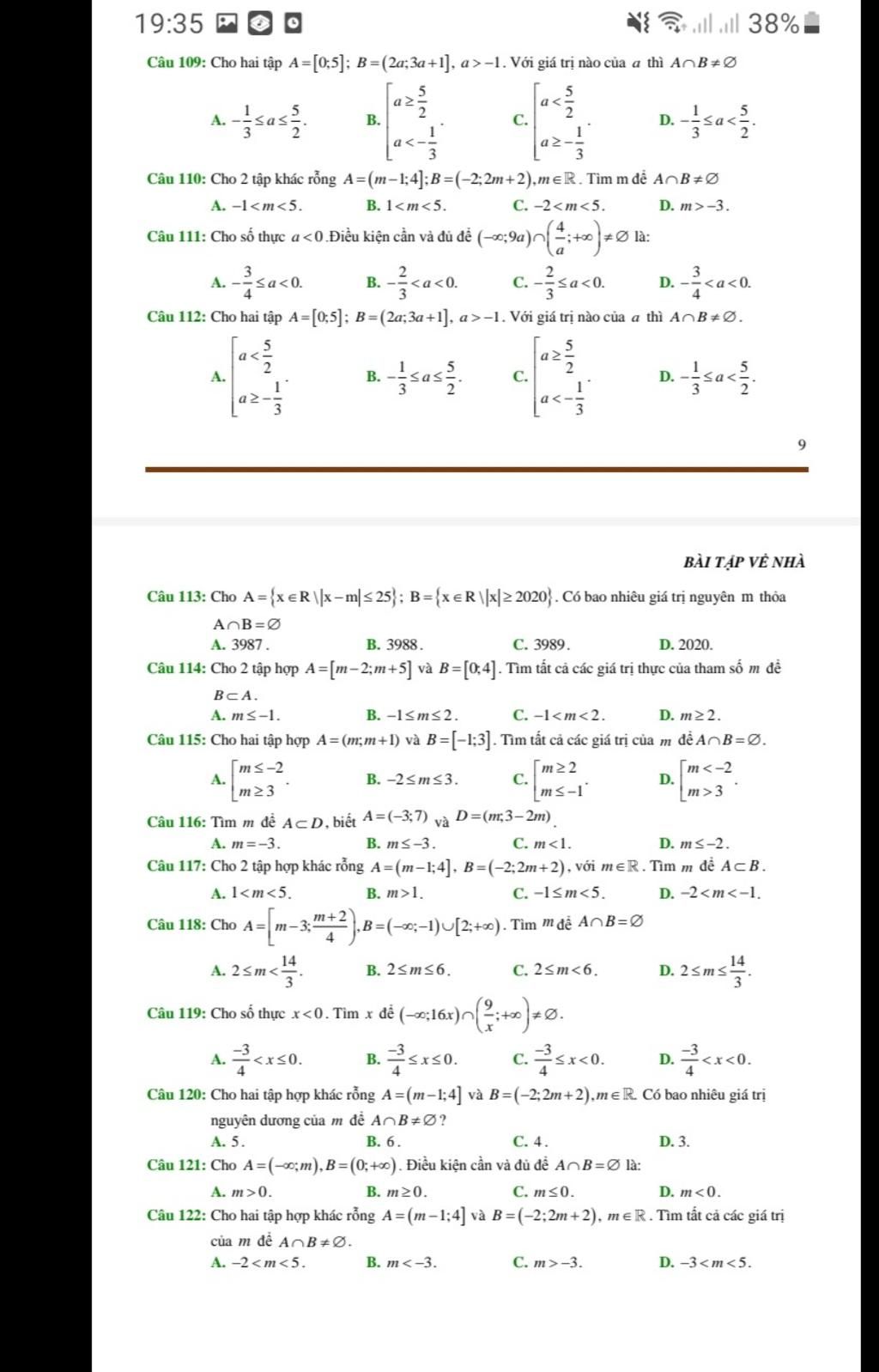 Câu 110: Cho 2 tập khác rỗng A=(m-1;4];B=(-2;2m+2),meR . Tìm m để AnB+Ø