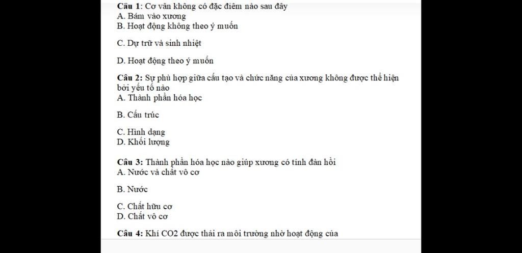 Câu 2: Sự phù hợp giữa cấu tạo và chức năng của xương không được thể hiện