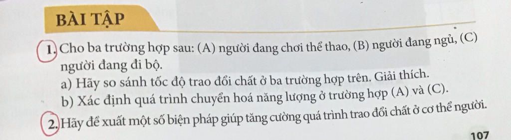 - Do tốc độ trao đổi chất phụ thuộc vào nhu cầu năng lượng của cơ thể. Nhu cầu năng lượng càng cao thì tốc độ trao đổi chất và chuyển hóa năng lượng càng nhanh và ngược lại. Ở 3 trường hợp trên, trường hợp cần năng lượng nhiều nhất là người đang chơi thể thao (A), trường hợp cần vừa năng lượng là người đang đi bộ (C), cuối cùng là người đang ngủ (B)